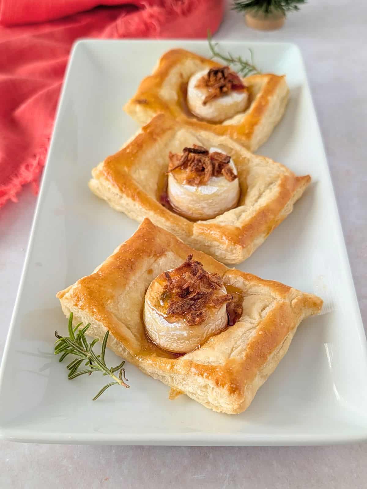 Bake at 375°F for 20 minutes, or until the edges are golden and puffed. These brie puff pastry tarts are best enjoyed within 30 minutes of baking so the cheese stays warm and melty.