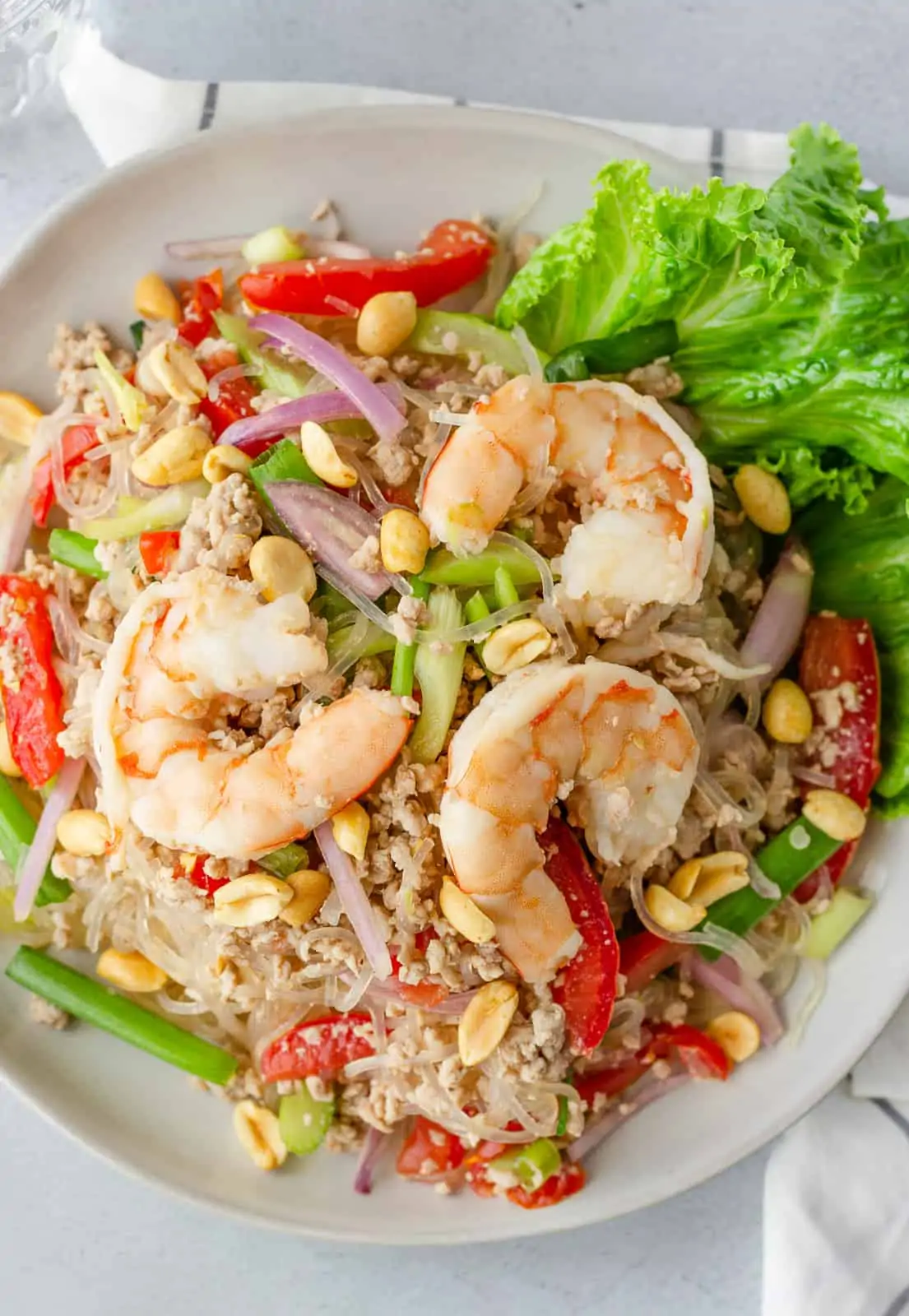 Yum Woon Sen is a Thai Glass noodle salad mixed with fresh herbs, ground pork, shrimp, and tossed in a spicy Thai dressing.